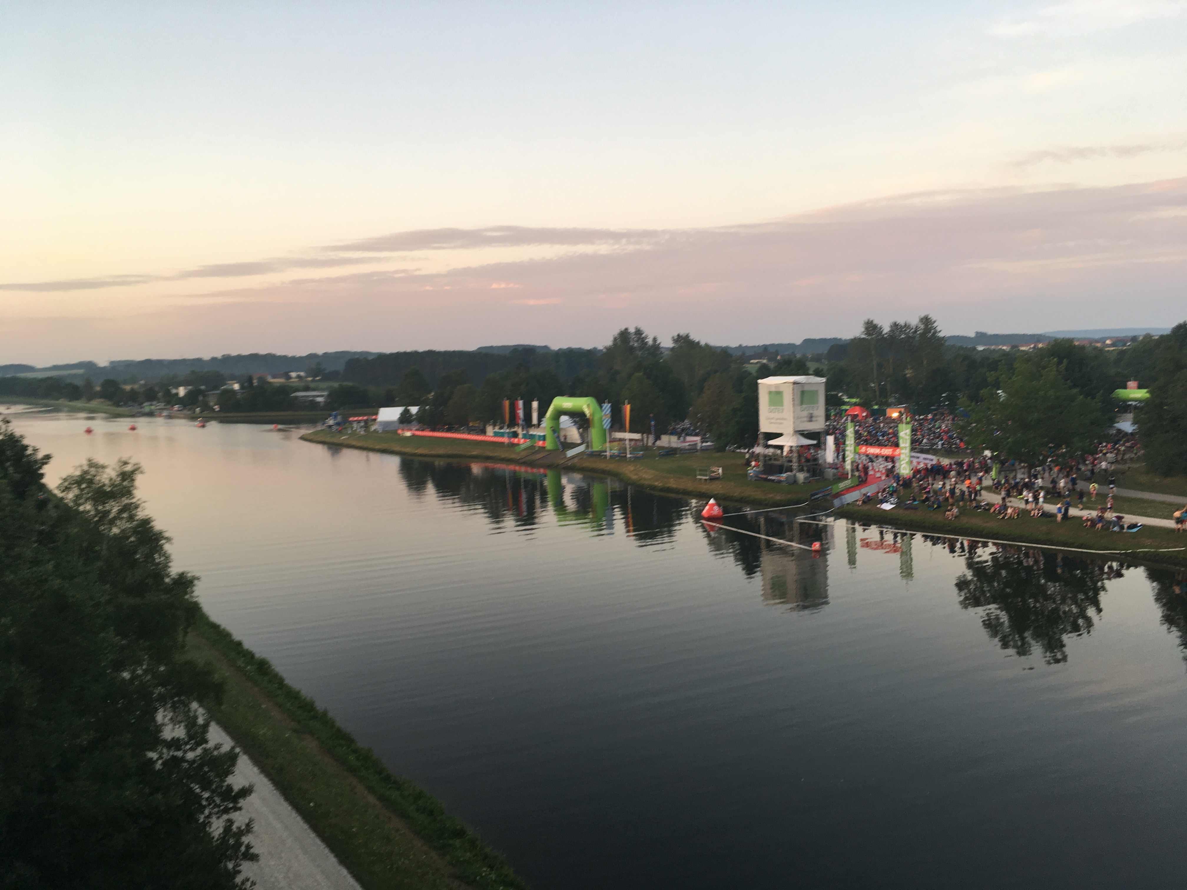 The swim was held in the warm waters of the shipping canal running through the Bavarian forest. The conditions were calm and athletes given 5 minutes between more cannons signalling the next wave.